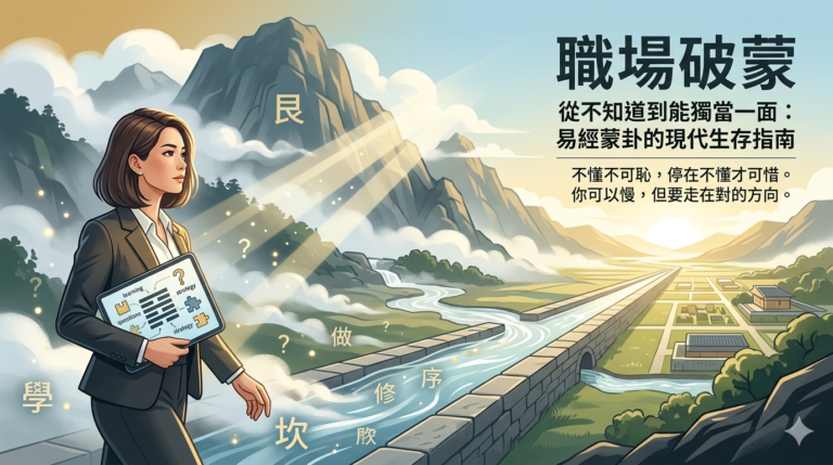 在職場與人生的某些階段,我們常感到努力卻看不清方向。《易經》第四卦「蒙卦」揭示:迷惘並非失敗,而是成長必經的學習期。本文以現代職場視角解析蒙卦象義、卦辭與六爻,說明如何在不確定中建立學習方法、提升提問能力與突破成長瓶頸。如果你正面臨轉職焦慮、新手壓力或人生卡關,這篇文章將帶你理解:不懂,正是變強的開始。